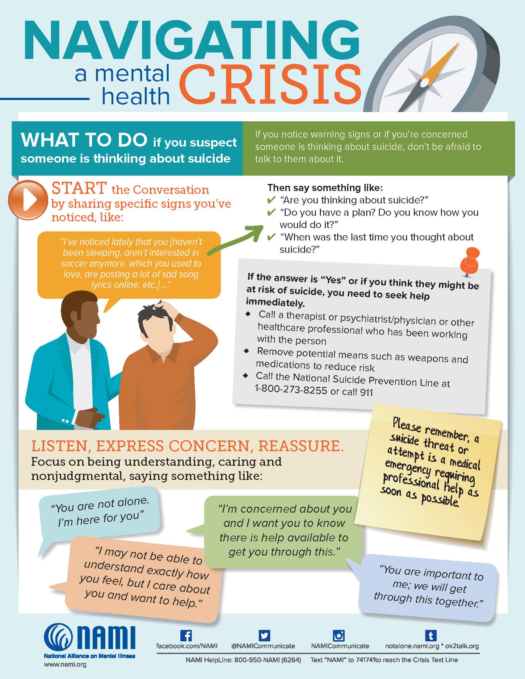 The National Alliance for Mental Illness has prepared a one-pager on how to open a dialogue if you suspect that someone you know may be considering suicide. It is depicted and can be downloaded here .